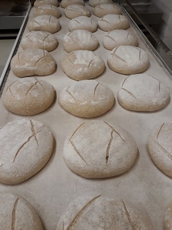 Dans un premier temps, c’est l’étape du pétrissage : les ingrédients sont mélangés dans le pétrin (farine, eau, levure et sel, levain). Puis, nous effectuons l’étape du pointage qui correspond à la première fermentation c’est à dire au repos de la pâte. Ensuite c’est l’étape de la pesée où nous divisons la pâte en pâton, délimitant les différents pains confectionnés. Nous façonnons votre pain et la mettons au repos pour la phase d’apprêt. C’est la phase où la pâte triple de volume !